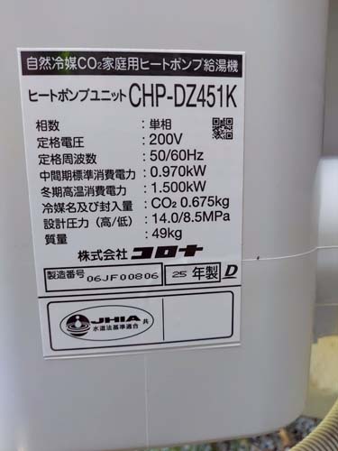 富士市永田町 コロナ自然冷媒CO2家庭用ヒートポンプ給湯機 ヒートポンプユニットCHP-DZ451K エコキュート交換工事
