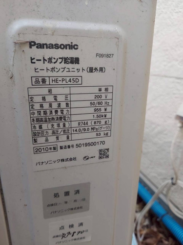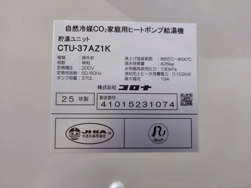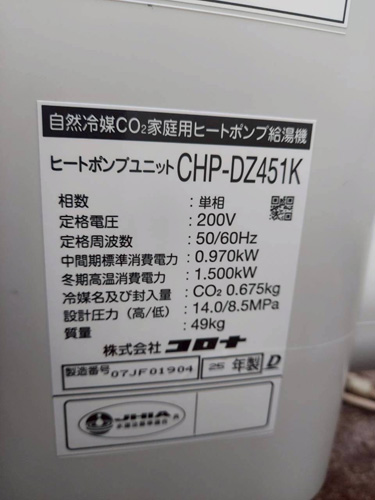 磐田市中泉 パナソニックヒートポンプ給湯機ヒートポンプユニット(屋外用)HE-PL45D→コロナ自然冷媒CO2家庭用ヒートポンプ給湯機ヒートポンプユニットCHP-DZ451K、貯湯ユニットCTU-37AZ1K エコキュート交換工事