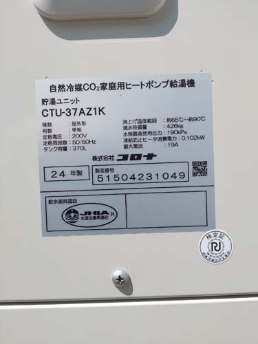 南伊豆町 コロナ自然冷媒CO2家庭用ヒートポンプ給湯機 貯湯ユニットCTU-37AZ1K、ヒートポンプユニットCHP-DZ451K エコキュート交換工事